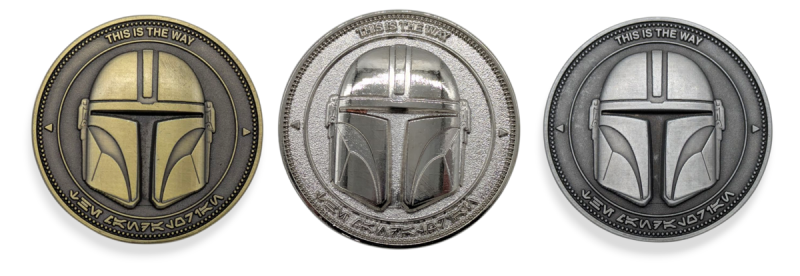 We offer a FREE variations service that allows our clients to create multiple versions of the same design using different platings on your coins. These Mandalorian coins look striking in antique silver, antique gold, and nickel (but we have way more options than that).