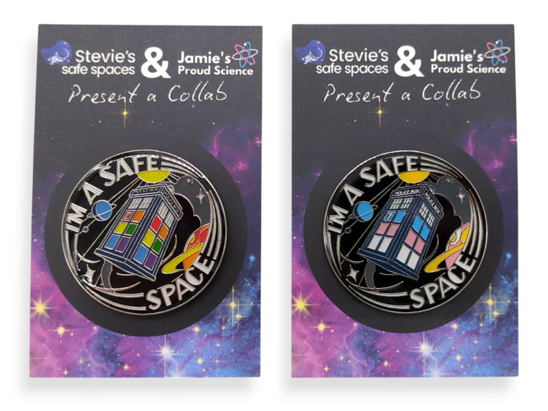 We left them to it while they got their heads together, plotted, and schemed their way to coming up with the simple yet striking idea of combining their two most popular products, the Stevie's Safe Spaces pin badge and the iconic LGBTQ+ & Trans flag TARDIS pins.